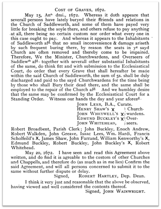 May 1672 it was decided that the method of contributing to the cost of burying was not equitable and approval was gained so that the Church could fix the cost to 5s.