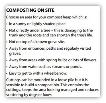 We have chosen a similar design to the featured picture above. Made from planks of wood screwed together into a simple box which can be three or four sided. Pallets, which allow more air, make good compost bins. Pallet compost bins give many access points for animals such as hedgehogs or slow worms. They are easy to construct by driving stakes through the pallet. Pallets come in standard sizes so fit together well. Building two bays to your compost bin allows one bay to be actively filled over the growing season whilst the other bay is left to compost. In the autumn empty the composted side. Put any material which has not composted into the second bay and start to fill the now empty first bay with grass cuttings. An ideal gardener’s compost heap contains a mix of material: grass cuttings, coarse grass, dead leaves, and cardboard. It should be turned at least once or twice a year and can produce compost quickly. By contrast a compost heap in a burial ground is there to get rid of unwanted waste and to provide a haven for wildlife. Do not worry if there is not the ‘correct’ mix of materials