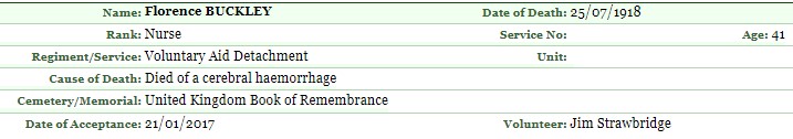 Nurses in Active Duty project, got in touch and brought to our attention Florence. This ongoing project of In From The Cold Sacrifice Remembered, highlights the individuals who died in the service of Britain and the Commonwealth during two world wars.