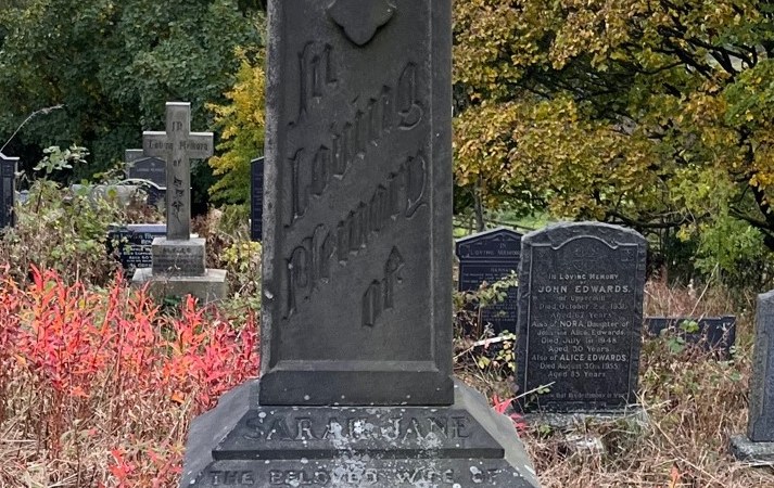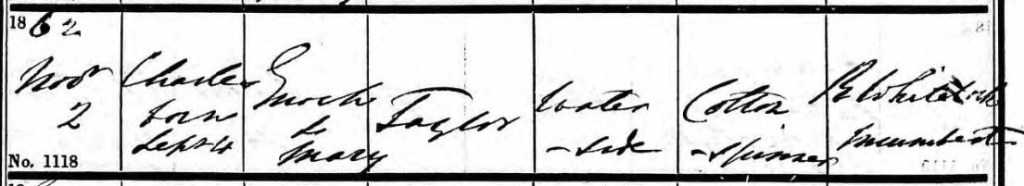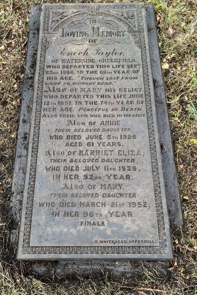 Mary Taylor is buried in Saddleworth Churchyard, along with her mother Mary (Buried 16/06/1897), father Enoch (Buried 27/09/1886), and her sisters Annie (Buried 08/06/1926) and Harriet Eliza (Buried 15/07/1939) and infant brother.