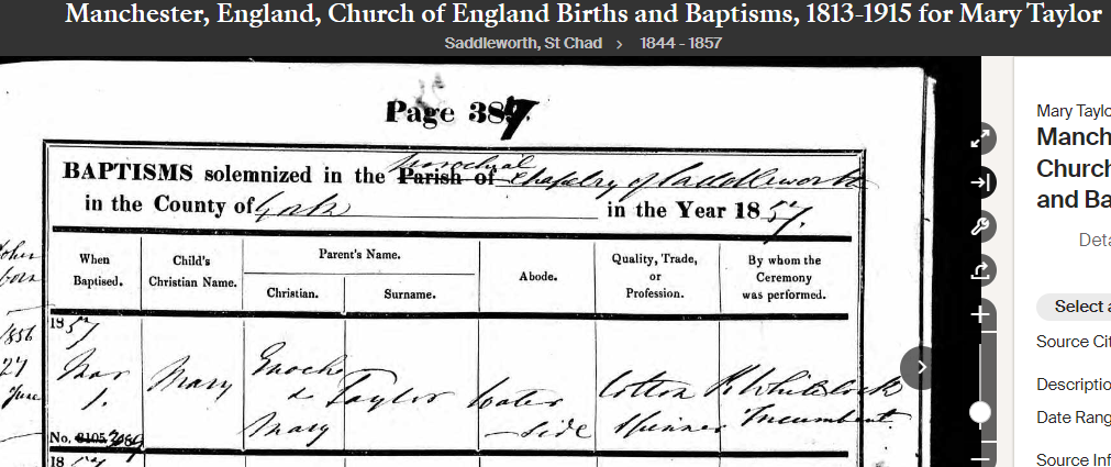Mary Taylor (one of Sarah Jane Taylor’s sisters and therefore my great great aunt). Born 26/06/1856, died 29/03/1952. Mary seems to have been a fascinating character, best described in a newspaper cutting recording her death as “Saddleworth’s oldest resident”. I’m attaching a copy of the cutting, a picture of Mary, her baptism record (apparently at St Chad) and, for interest, her probate. And the section in the cutting about her riding in a trap on Sundays from Greenfield to Holmfirth – that would have been quite a trip…