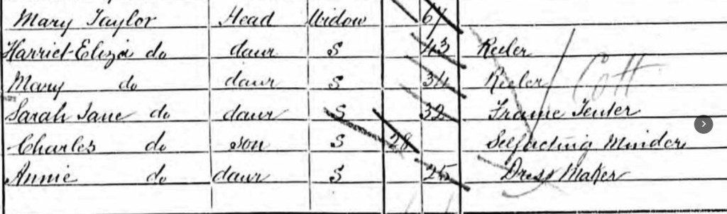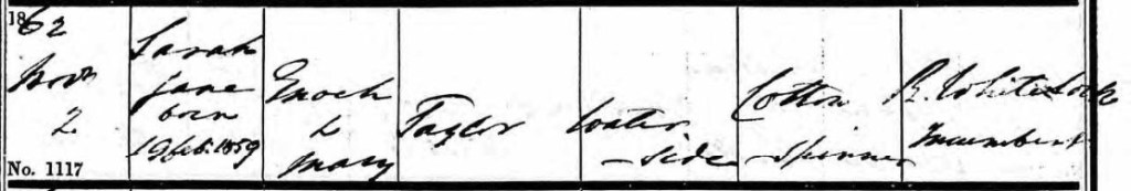 Enoch had 6 children (plus the unexpected reference to an infant death) Mary, Harriet Eliza, and Annie are in the same grave. The Parish Records indicate that they lived at Waterside Mill, Greenfield. Census records 1891 indicate Waterside Cottages. S meaning all the children were single at this time.