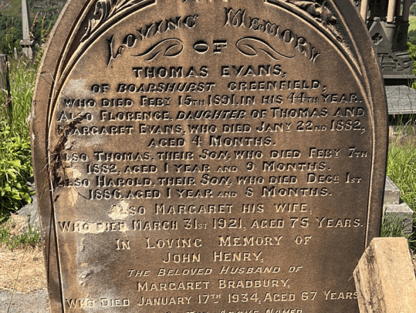 Thomas Evans, and his wife, Margaret ran a school in Greenfield. Longing for a family, they had a little boy (Thomas) and then a girl (Florence) – but tragically Florence died when only 4 months old with Thomas dying just 16 days later. Joy returned to their lives two years later with the birth of a second son Harold – but he too was to die before he was 2 years old. Infant deaths were not uncommon – but to lose all your children with no surviving siblings was rare and particularly tragic for a pair who lived and worked as teachers surrounded by children.