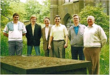 The peal band assembled around James Platts grave before the peal. Left to Right:- 1- Jeffrey Brannan. (C) 2-Martin Gill. (first peal) 3-Arthur Rogers. 4- Keith Slater. 5- Geoffrey Nield. 6- J.Richard Senior