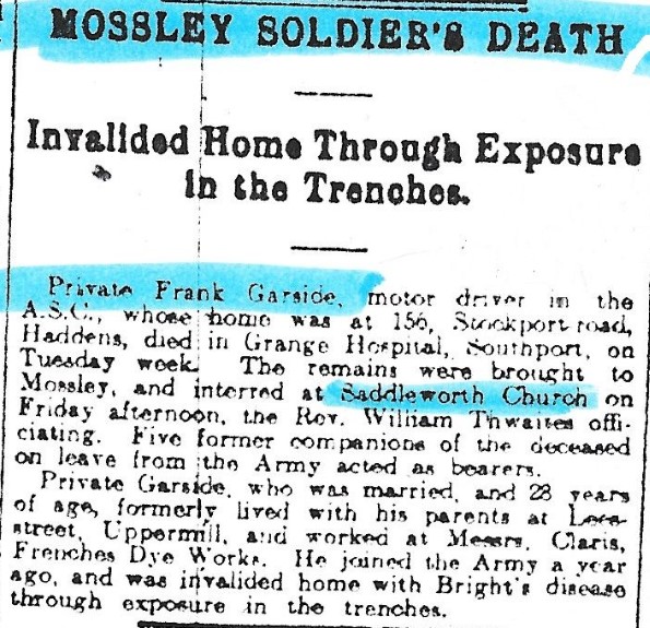 Frank enlisted first in the Territorials in 1906 in Uppermill, then 14th April 1908 as Private 194 in the 7th Battalion West Riding Regiment. He was living at Railway View, Uppermill at the time. On 13th September 1909 he joined the Royal Field Artillery Special Reserve. he was promoted to Lance Corporal on 16 June 1915. and in 1916 he later joined the Royal Army Service Corps as a private. Frank became seriously ill and was admitted to Grange Military Hospital in Southport.