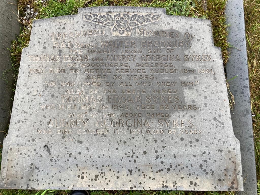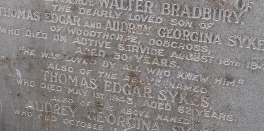 Walter (1100792) was a RAF Sergeant, Volunteer Reserve. Originally from Woodthorpe, Dobcross he died 18/08/1941 in Oxfordshire, whilst on active duty in a flying accident, aged 30. Listed on the CWG site, he was the son of Thomas Edgar and Audrey Georgina Sykes.