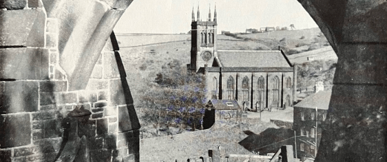 Page 1, Shows the Church from the view from the Lytch Gate on the corner entrance to the very, large Churchyard known as New Yard.