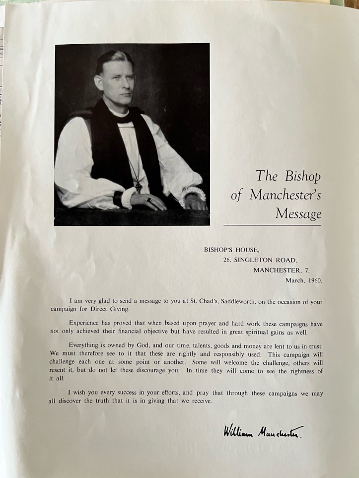 Page 2, includes a picture and a letter from Bishop William Manchester