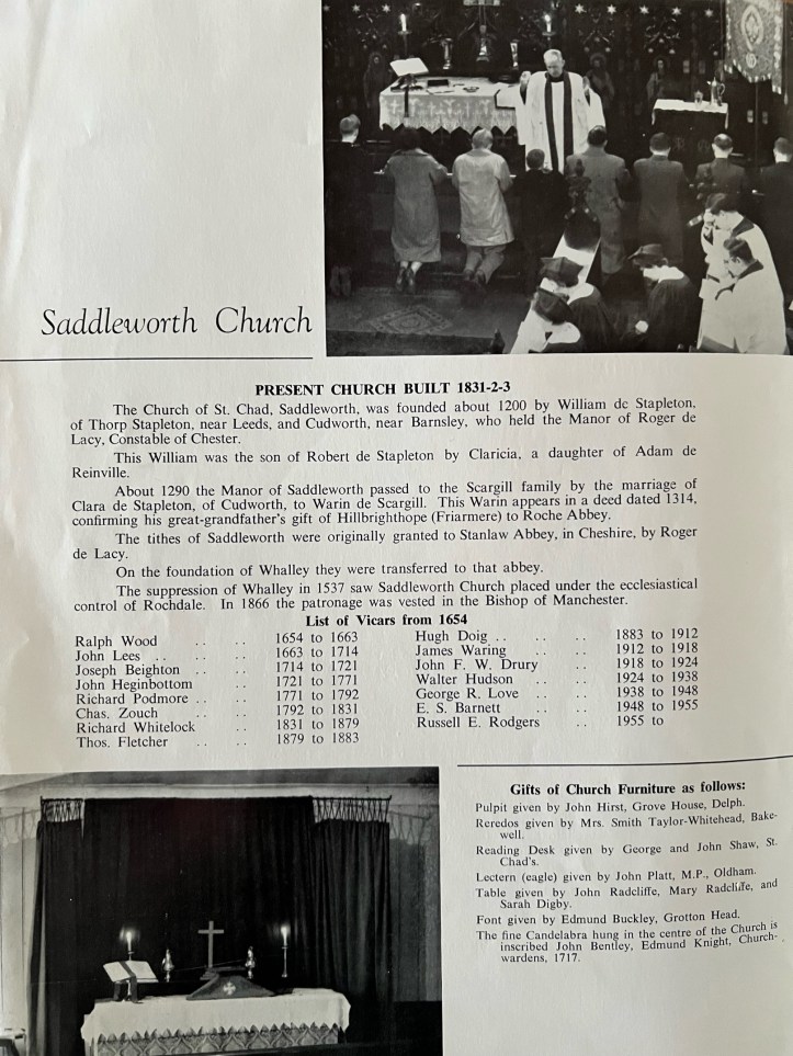 Page 4, Has 2 interior pictures, one taken during a service in Saddleworth Church, the other either at the Parish Centre or Kilngreen. There is also an outline of the history of the building and a list of Vicars from 1654. Of particular interest is a short list itemising some gifted furniture.