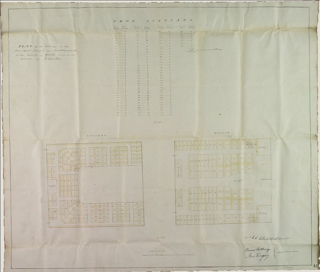 The plans also included the introduction of Free Seating. Increasing capacity to 672 places. this was drawn up by J Shaw and Adbram Bentley and was signed by the Vicar Rev Whitelock and churchwardens Thomas Bradbury and Ben Wrigley.