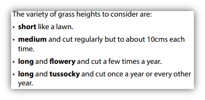 Is likely to contain more plant and animal life, though a spring meadow looks nice, it does make the terrain tricky to navigate. Areas should be set aside within the plan to maintain the benefits. As there is some considerations when cutting and removing. These areas should have an element of control such as separate areas for spring flowers and another for summer flowers with a regime for cutting either section when necessary. Which means these areas can be left for a period of 12 to 16 weeks. Allowing most of the plants to grow, flower and set seed though we should not delay the cut too long as this affects future growth. Cutting after the end of August leads to the strength of the grasses being stored in the roots. Over time the sward will become rank, tussocky and lose wildflowers.