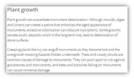 Ivy is great for bees and other insects and can contain birds’ nests and roosting bats. It can also protect stonework from wind, freezing temperatures, erosion, and airborne pollution. However, it can be damaging to memorials with joints or cracks and may need to be removed or trimmed regularly.