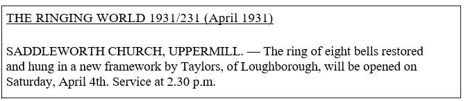 The Church authorities deserve every praise for the manner in which they have tackled this restoration, for, despite heavy financial burdens in other directions, they bravely set their shoulders to the wheel and made a job of it. We believe that Mr Burridge, one of the wardens, greatly interested himself in the bell scheme, and has been a tower of strength towards its fulfilment. Great thanks are due to him and all those who assisted in attaining such a splendid result. The proof of the pudding is in the eating of it, and there is no doubt that Taylors have done this job ‘to a turn’ and those who ring at Saddleworth can do so to their hearts’ content.