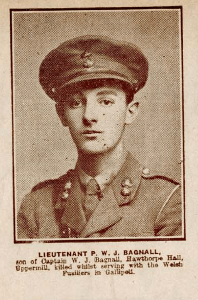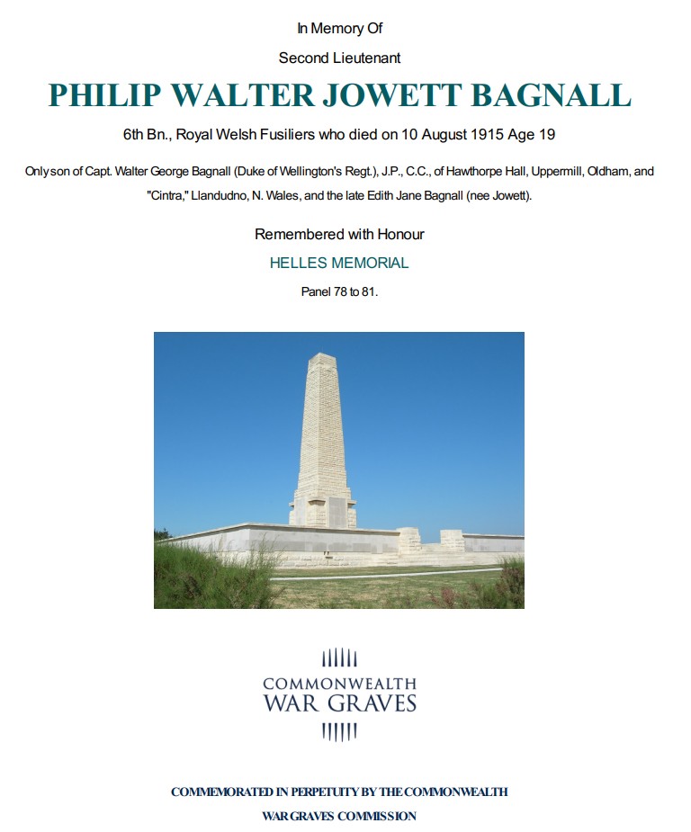 Remembered also at the CWGC, Second Lieutenant Philip Walter Jowett Bagnall, of regiment Royal Welsh Fusiliers 6th Bn. died 10th August 1915 aged 19 years old. buried or commemorated at Helles Memorial in Turkey (including Gallipoli)